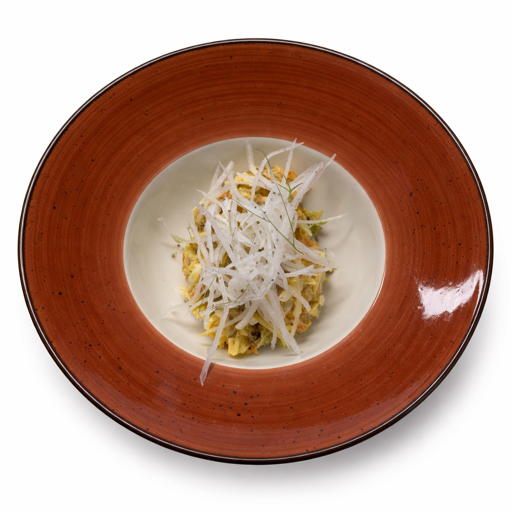 Классическое сочетание пряной сельди и сливочного масла в нежной текстуре паштета. Подаётся с ржаными гренками и тонкими кольцами красного салатного лука. 130/110
